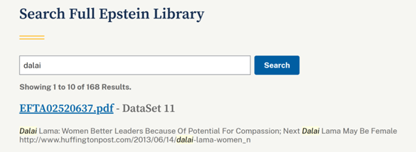Le 5 février, des médias ont constaté que le mot-clé « dalai » apparaissait 168 fois dans les dossiers Epstein.