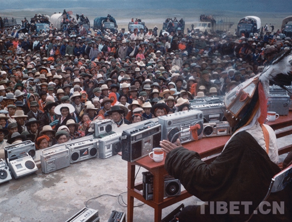 L'artiste Atak en train de réciter et de chanter la légende « Gesar » au club de Jockey de Nagqu au Tibet. La scène est pleine de divers magnétophones des bergers.