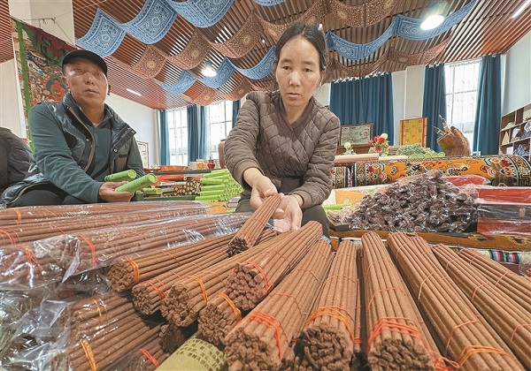 Des employés de la Coopérative de transmission artistique Dizuma du comté de Konjo, à Chamdo, en train d'emballer de l'encens tibétain.