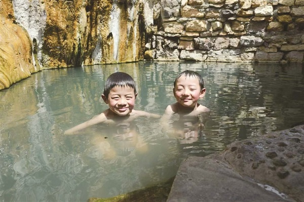Sur la photo : des enfants s'amusent aux sources chaudes de Dezong.