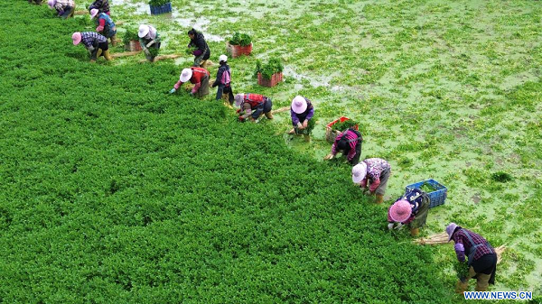 Photo aérienne prise par un drone le 18 novembre 2025 d'agriculteurs récoltant de la coriandre à Tangshan, ville de la province du Hebei, dans le nord de la Chine. (Photo : Liu Mancang)