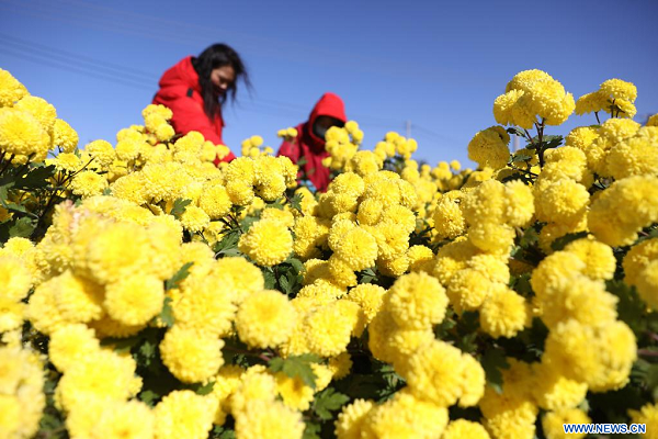 Des employées cueillent des chrysanthèmes à Jiaozuo, ville de la province du Henan, dans le centre de la Chine, le 19 novembre 2025. (Photo : Xu Hongxing)