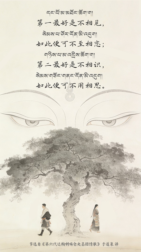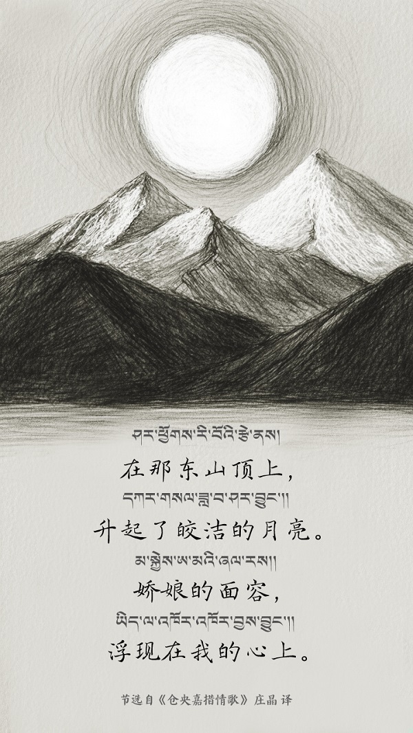 Depuis plus de 300 ans, la poésie de Tsangyang Gyatso est largement acclamée et connue de tout un chacun. Né en 1683 au palais de Shar Cuobai Kar, à Lawo Yulsung, dans la région de Monyul au Xizang (aujourd'hui Wujinlin, dans la région de Monyul au Xizang), Tsangyang Gyatso fut officiellement reconnu en 1697 par le gouvernement central de la dynastie Qing comme le sixième Dalaï-Lama et fut alors conduit au palais du Potala pour y être intronisé. Ces dernières années, l'œuvre de Tsangyang Gyatso et son histoire ont gagné une large audience grâce aux médias traditionnels et émergents, ses poèmes ont fait l'objet de nombreuses traductions, chacune présentant des caractéristiques propres, ces œuvres poétiques incarnent l'ADN culturel de la nation chinoise : elles nourrissent l'âme des lecteurs et offrent aux artistes une source inépuisable d'inspiration et de création.
