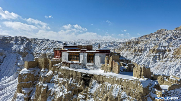 Photo aérienne prise par drone montrant les ruines du royaume de Guge dans le district de Zanda de la préfecture de Ngari, dans la région autonome du Xizang (sud-ouest de la Chine), le 24 janvier 2026. (Photo : Tinzen Tseten)