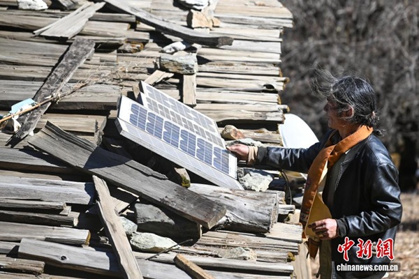 Tenzin Peichu ajuste des panneaux solaires sur le toit d'un cabanon en bois.