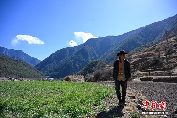 Tenzin Peichu marche dans le village de Niru, entouré de champs d'orge tibétaine verdoyants.