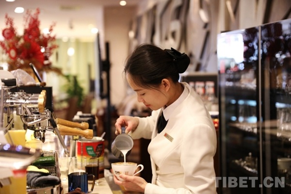 Un employé du bar à boissons de l'espace pause-café du centre de presse des Deux Sessions nationales 2026 réalise un latte art sur un café