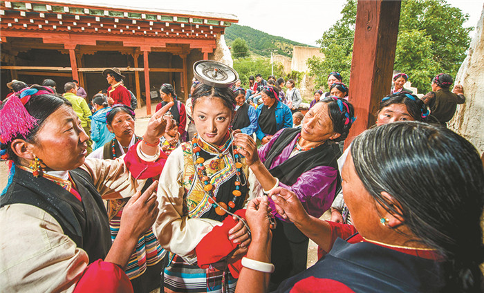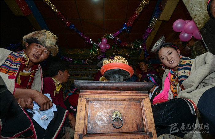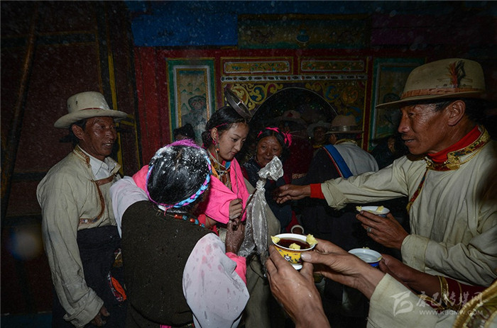 བག་མ་ལ་ཆ་བཞག་ན། རྒན་པོ་རྣམས་ཀྱིས་གཡང་གིས་གསོ། མ་སྲུ་རྣམས་ཀྱིས་གླུ་ཡིས་གསོ། བུ་ཚ་བུ་མོ་རྣམས་ཀྱིས་བྲོ་དང་ཁྲོམ་གཞས་ཀྱིས་གསོ། ཇ་ཆང་གཉིས་ཀྱིས་ཟམ་བཙུགས། ཕྲུག་དཀར་ལྗང་གཉིས་ཀྱིས་གདན་ཐོག གཡུ་བྱུ་རུ་གཉིས་ཀྱི་རྒྱན་ཆ། དར་གོས་ཅན་གཉིས་ཀྱི་ཐོག་ལ། དོ་ནུབ་བཀྲ་ཤིས་པའི་གཡང་གདན་ཐོག་ལ་བཞུགས་གདན་འཇགས་རོགས་བྱེད་རྒྱུ་ལ་དགའ་སྤྲོ་དཔེ་དང་དམ་པ་ཆེ་སྣང་ཟེར་ཏེ་ལབ་དོན་ཞུ་དགོས་སྣང་ལ།