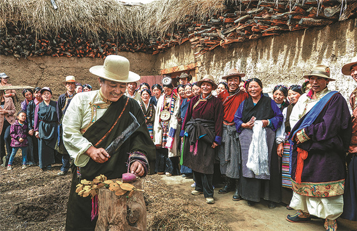 དེའི་རྗེས་ལ་བོད་ཕོ་གཞི་མོ་གནས་གཉེན་གཞི་ཚང་གསུམ་ལ་ཆ་བཞག་ན། འཁོར་བའི་ས་ཆགས་ཐབས། རུས་པས་རྡོ་བཟོ་ཐབས། བུ་མོ་གཅིག་འདུག་ན་བུ་གཅིག་སྐུལ་དགོས། བུ་གཅིག་འདུག་ན་བུ་མོ་གཅིག་སྐུལ་དགོས།དང་པོ་གཉེན་ཨ་བྱེད་ཟེར་ནས་ཕ་རོལ་བྲག་དཀར་རྐེད་ལ་སྐད་གཏོང་། གཉེན་བྱེད་ཆོག་ཟེར་ཏེ་ཆ་རིང་རྒྱ་གྲོང་ནང་ལ་ལན་འོངས། ལེན་འོངས་སའི་ཐོག་ལ། འབྱུང་བའི་ཆ་མཉམ། རུས་པའི་བརྡ་བཞིན། ལྷས་འབོད་ན་ཨ་ཟེར། བདུད་རྩི་ཡོང་ན་ཁ་གདངས་བའི་སྐབས་སུ་ལ། བདག་ཕུན་འཛིན་གཉིས་རེད་ཐལ་གསུངས་ནས་ལ། ནས་སྲན་མ་མིན་པ་ཆང་བཙོ། འབྲུ་ཡུངས་གཞི་མིན་པ་ཕྱེ་བཏགས། རི་རྒྱལ་འབྲོང་མིན་པ་ཤ་བཤག བྱ་རྒོད་ལག་མིན་པ་མགྲོན་འབོད། དོ་ནུབ་འདིའི་བཀྲ་ཤིས་པའི་གཡང་གདན་ཐོག་ལ་བྱ་མས“སྒོང”ཟེར་རན་བྱ་ཆུང་གིས་“རོགས”ཟེར་ནས་འཛོམས་ཡོང་རོགས་པ་ལ་དགའ་སྤྲོ་དཔེ་དང་དམ་པ་ཆེ་སྣང་།