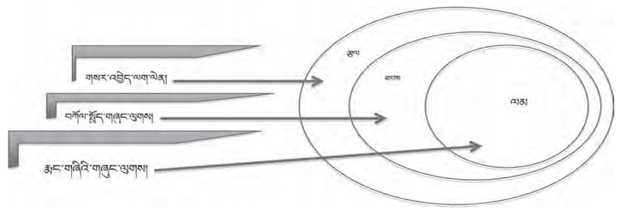 མིའི་རིགས་ཀྱི་ཤེས་བྱ་གྲུབ་སྟངས་ཀྱི་རིམ་པ་གསུམ་དེ་རི་མོའི་ལམ་ནས་མཚོན་ན། ནང་ནས་ཕྱིའི་རིམ་པ་ནི་རྨང་གཞིའི་གཞུང་ལུགས་དང་བཀོལ་སྤྱོད་གཞུང་ལུགས། གསར་འབྱེད་གཞུང་ལུགས་དང་བཅས་གསུམ་སྟེ། མི་གང་རུང་ཞིག་གི་བསམ་བློ་དེའང་མིའི་རིགས་ཀྱི་ཤེས་བྱའི་རིམ་པ་གསུམ་གྱི་སྒྲིག་གཞི་དང་གཅིག་མཐུན་དུ་གནས་ཡོད། ལམ( 道 )ནི་ཅི་ཡིན་པའི་ཤེས་བྱ་སྟེ། ཚེ་སྲོག་ལྟ་ཚུལ་དང་འཇིག་རྟེན་ལྟ་ཚུལ་ནས་མགོ་བཟུང་ཞིང་། དེ་ལས་བརྩེ་བ་དང་རིན་ཐང་སོགས་རྗེས་སུ་གྲུབ། ཐབས( 法 )ནི་ལམ་གྱི་རྨང་གཞིའི་ཐོག་ནས་རྗེས་སུ་གྲུབ་པའི་ཚེ་སྲོག་ལྟ་ཚུལ་དང་འཇིག་རྟེན་ལྟ་ཚུལ་ལྟར་དུ་མི་རྣམས་ཀྱིས་ཁྱབ་ཁོངས་མི་འདྲ་བའི་ཤེས་བྱ་སྣ་ཚོགས་སྦྱང་རྒྱུའི་གདམ་ག་གནང་བ་དང་། དེ་ལས་དམིགས་བསལ་གྱི་ཕྱོགས་སྟོན་རང་བཞིན་ལྡན་པའི་བརྡར་གཅོད་ཀྱི་ནུས་པ་ལྡན་པ་ཞིག་ལའོ། ། རྩལ(术)ནི་ཤེས་བྱའི་རིམ་པ་གོང་མ་གཉིས་ལས་ཐོན་པའི་དངོས་ཡོད་སྤྱི་ཚོགས་ལག་ལེན་ཁྲོད་ཀྱི་གདམ་ག་དང་ལག་བསྟར་བྱེད་པ་དེ་ཉིད་དོ། །①