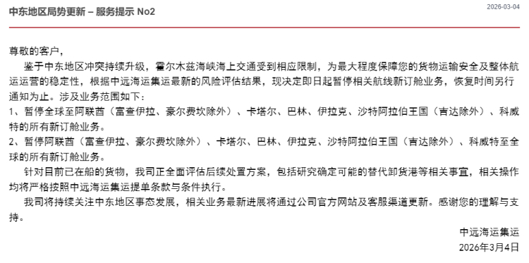 དེ་སྔོན། ཀྲུང་ཡོན་མཚོ་ཐོག་སྐྱེལ་འདྲེན་བསྡུ་འདྲེན་གྱིས་ཟླ3པའི་ཚེས4ཉིན་ཞབས་ཞུའི་དྲན་སྐུལ་ཁྱབ་བསྒྲགས་བྱས་ནས། དབུས་ཤར་ས་ཁུལ་གྱི་གདོང་ཐུག་མུ་མཐུད་ཛ་དྲག་ཆེ་རུ་ཕྱིན་པར་དམིགས་ནས་ཧོར་མུའུ་ཙི་མཚོ་འགག་གི་མཚོ་ཐོག་འགྲིམ་འགྲུལ་ལ་དེ་མཚུངས་ཀྱི་ཚོད་འཛིན་ཕོག་ཡོད། ཚད་གཞི་མཐོ་ཤོས་ཀྱི་ཐོག་ནས་ཁྱེད་ཀྱི་དངོས་ཟོག་སྐྱེལ་འདྲེན་བདེ་འཇགས་དང་དེ་བཞིན་མཚོ་ཐོག་སྐྱེལ་འདྲེན་གཉེར་སྐྱོང་ཧྲིལ་པོར་འགན་ལེན་བྱ་ཆེད། ཀྲུང་ཡོན་མཚོ་ཐོག་སྐྱེལ་འདྲེན་བསྡུ་འདྲེན་གྱིས་ཉེན་ཁའི་དཔྱད་དཔོག་བྱས་འབྲས་གསར་ཤོས་ལ་གཞིགས་ན། དེ་ཉིན་ནས་བཟུང་འབྲེལ་ཡོད་ཀྱི་མཚོ་ཐོག་གྲུ་གཟིངས་ཀྱི་ལས་སྒོ་གཉེར་མཚམས་འཇོག་པ་དང་། རྗེས་སོར་ལས་སྒོ་ག་དུས་གཉེར་མིན་བརྡ་ཐོ་གཏོང་གི་ཡིན་ཞེས་བརྗོད་ཡོད།