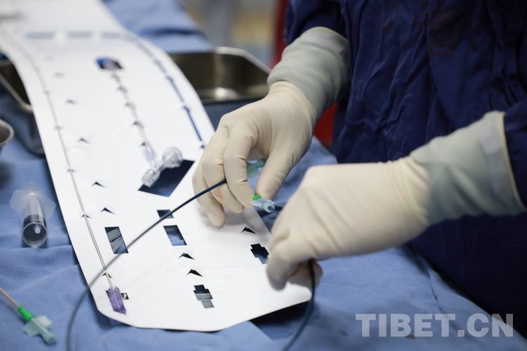 图为北医三院专家团队在为来自青海省果洛藏族自治州的先心病患儿手术时使用的直径仅4毫米的介入导管 摄影:刘莉
