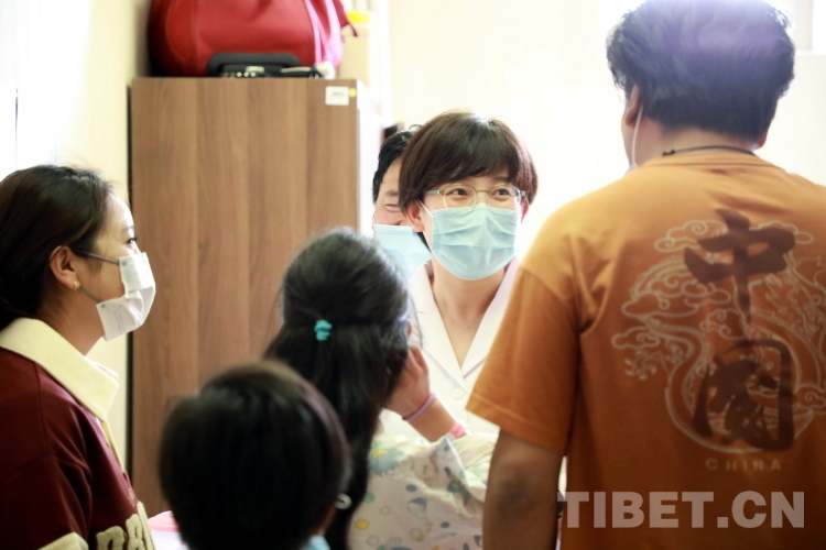 图为北医三院心脏外科主任医师、副主任张喆教授手术前到病房与来自青海省果洛藏族自治州的先心病患儿沟通 摄影:刘莉