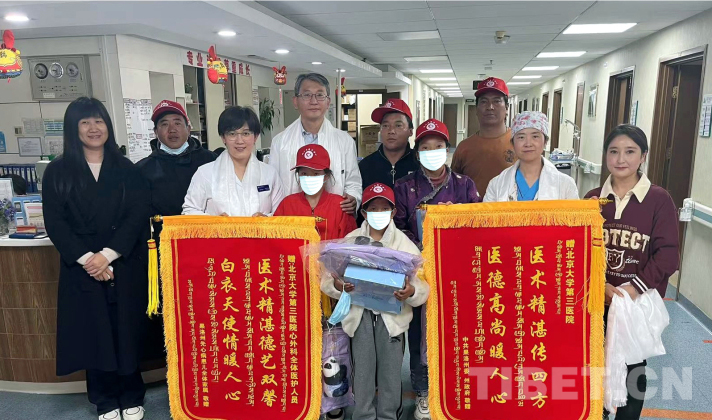 图为3名来自青海省果洛藏族自治州的先心病患儿及患儿家属等向北医三院敬赠锦旗 摄影:宫禧