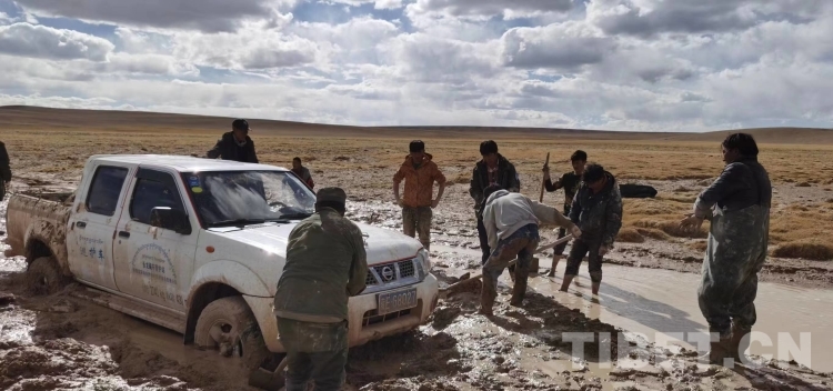 图为强巴和同事在巡护路上被困(强巴供图)