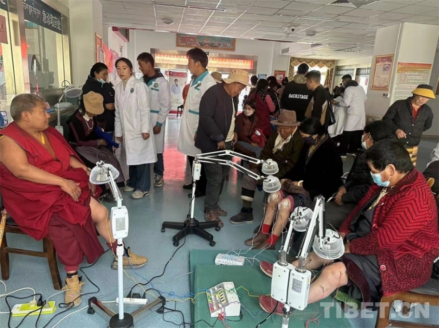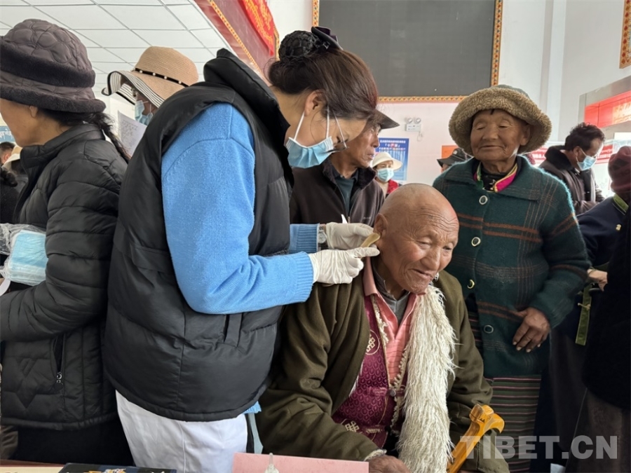 图为洛隆县藏医院及人民医院的医疗团队在现场开展平衡火罐、艾灸等中医诊疗服务 供图:洛隆县藏医院