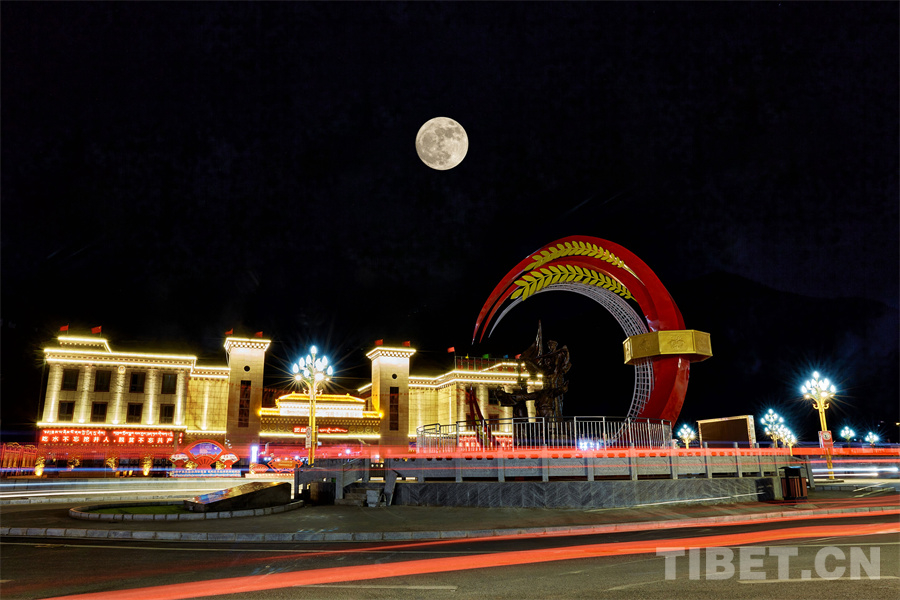图为洛隆县阿托卡新村的夜景,广场的灯光和高原的月光交相辉映