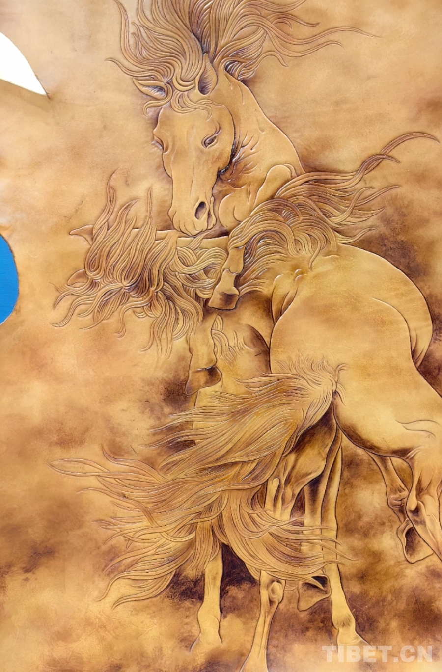 图为多县长江一号牧场参展的牛皮雕刻画《青海双骢》