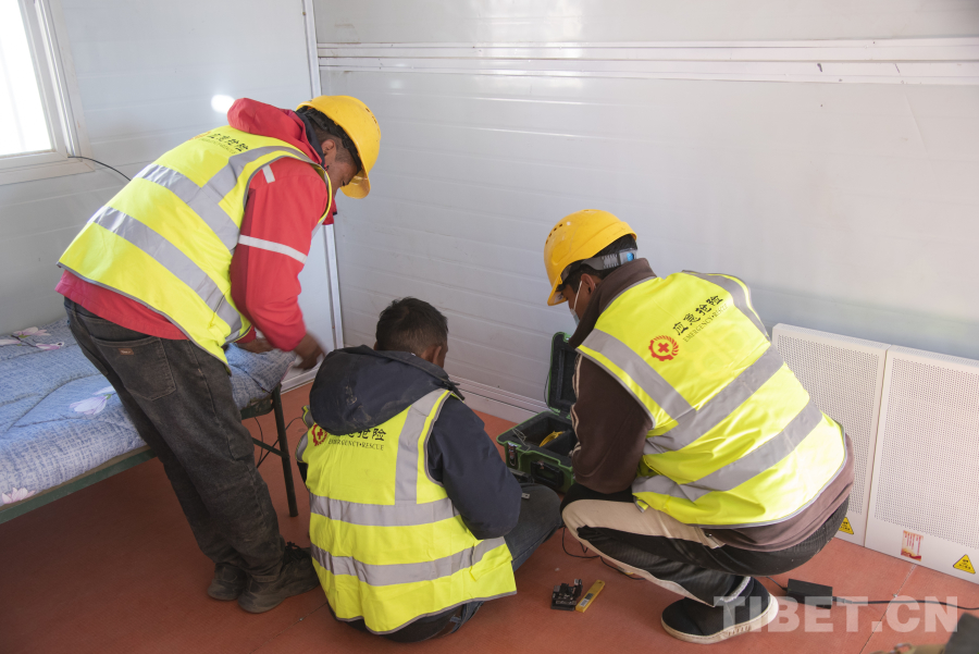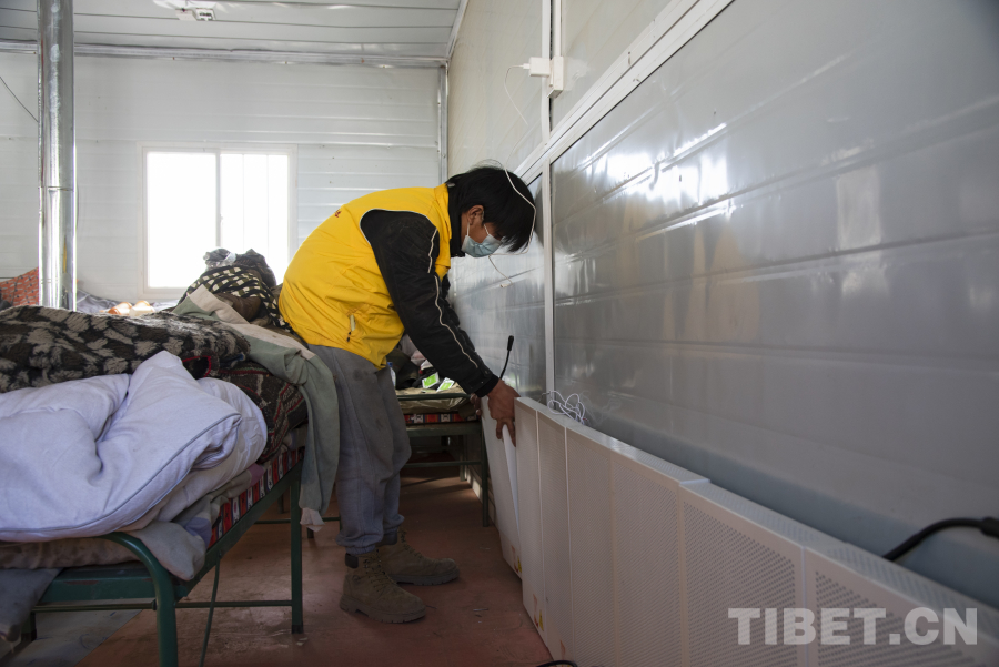图为工作人员正在古荣村安置板房内安装电暖器 摄影:赵振宇