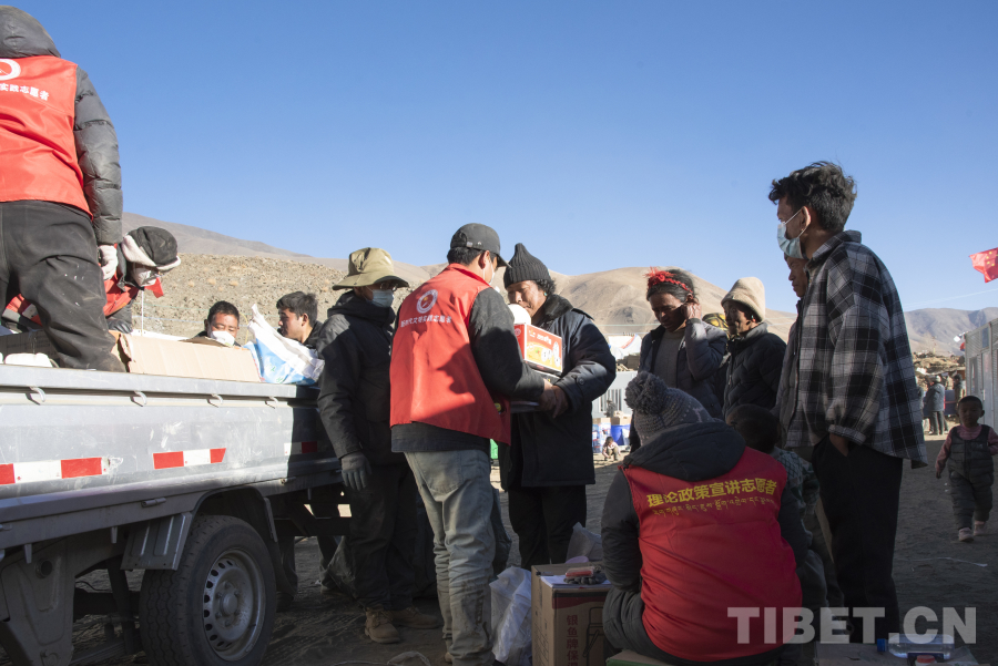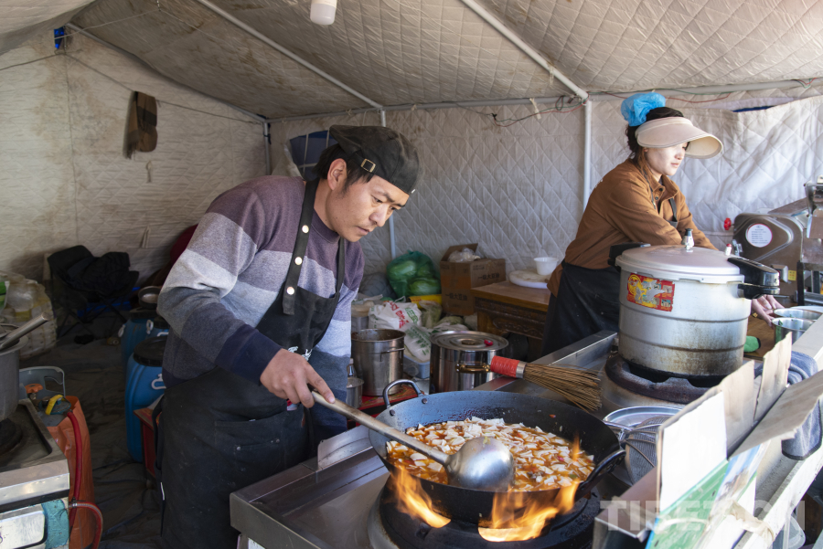 图为在古荣村受灾群众安置点,定日县安多餐馆的员工正在准备免费提供的餐食 摄影:赵振宇
