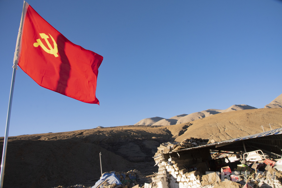 图为悬挂在古荣村救灾一线的党旗 摄影:赵振宇