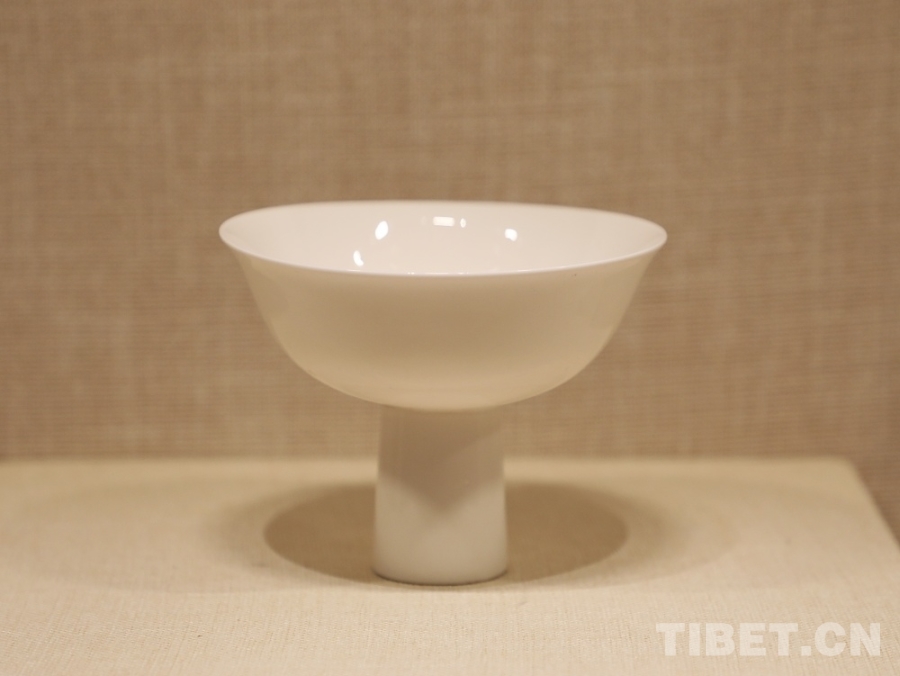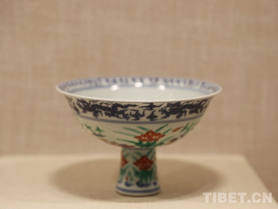 图为明宣德青花五彩莲池鸳鸯纹高足碗。经鉴定,这只内沿书写着藏文的高足碗是明代中央政府向萨迦寺赐送的实物见证 摄影:王茜