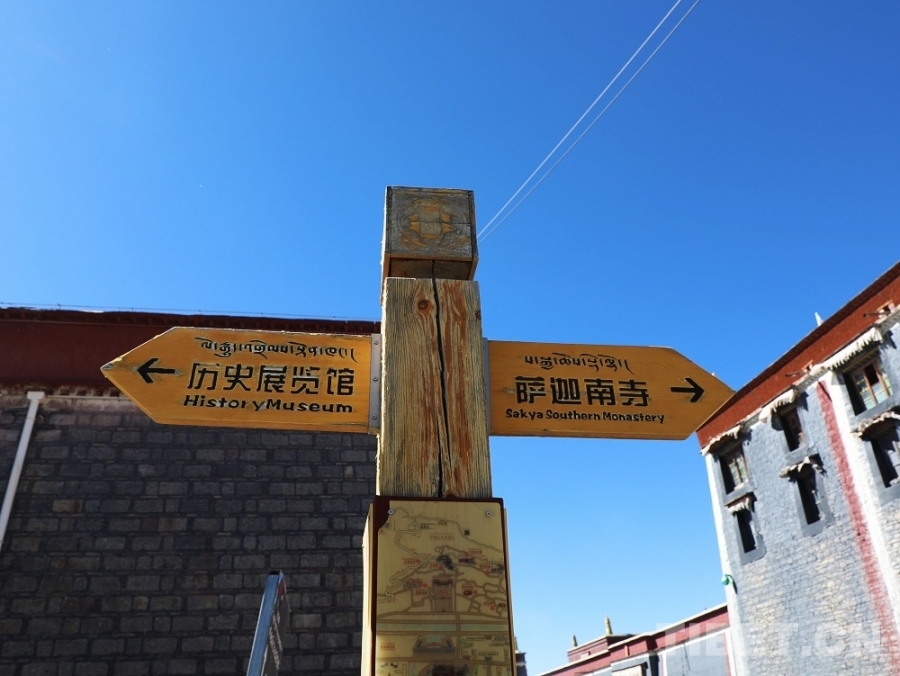 西藏萨迦历史文化展览馆距离萨迦寺不足百米。图为路标 摄影:王茜