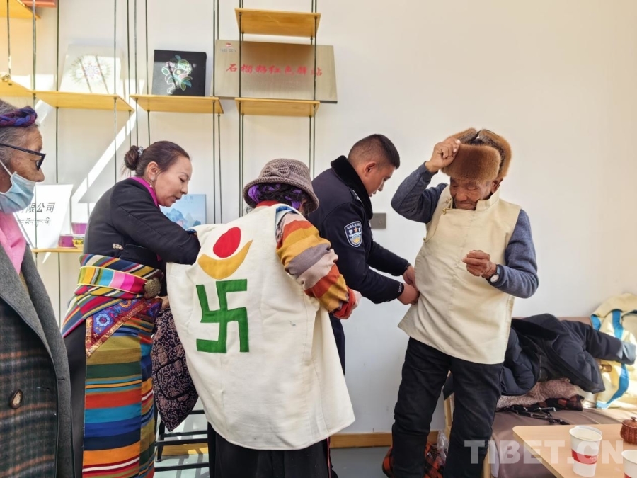 图为工作人员为社区老人穿上藏式服装