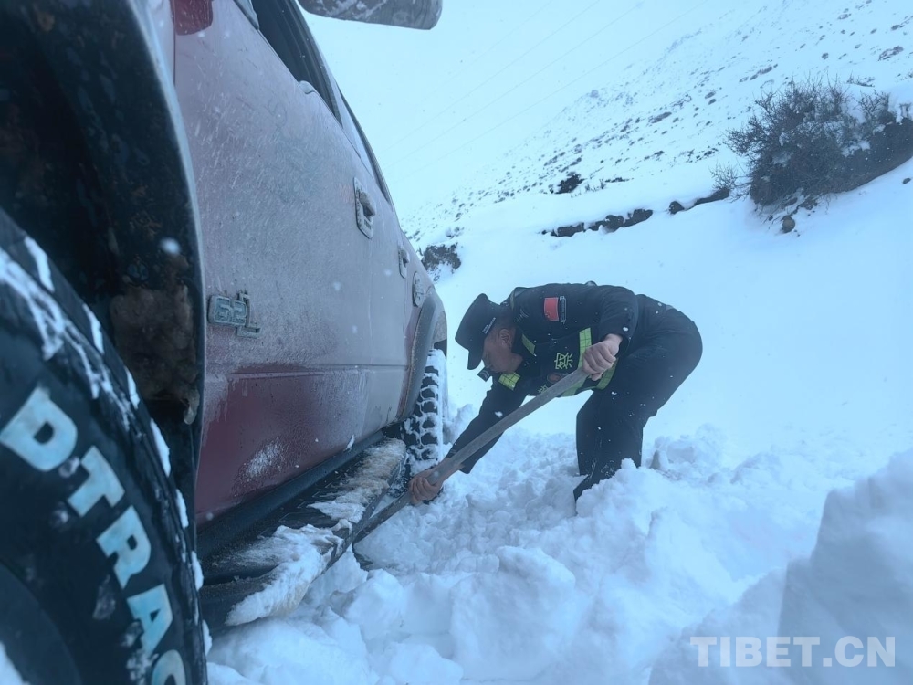 图为竹瓦根边境派出所民警为被困车辆除雪