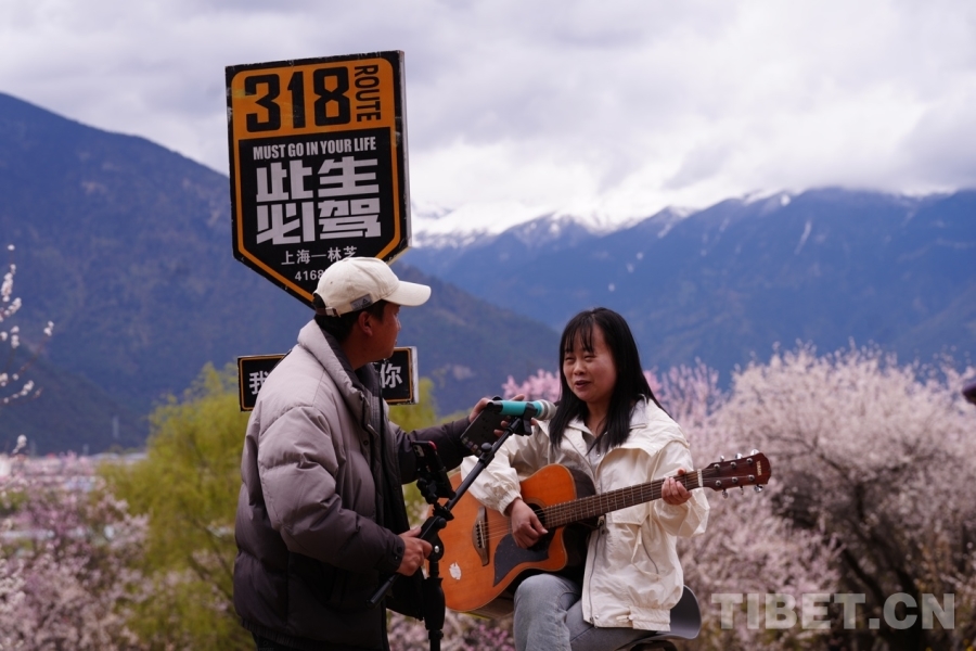 桃花树下,沿着阶梯往观景台方向走去,“此生必驾318”打卡路牌十分醒目,游客坐在一旁的座椅上拿起吉他,对着话筒深情歌唱,远处皑皑雪山与茂密的森林,近处粉白相间的桃花和金灿灿的油菜花构成一幅壮美画卷,让游客沉醉在歌声与美景中,苑宝录正忙着将这一瞬间拍摄记录。