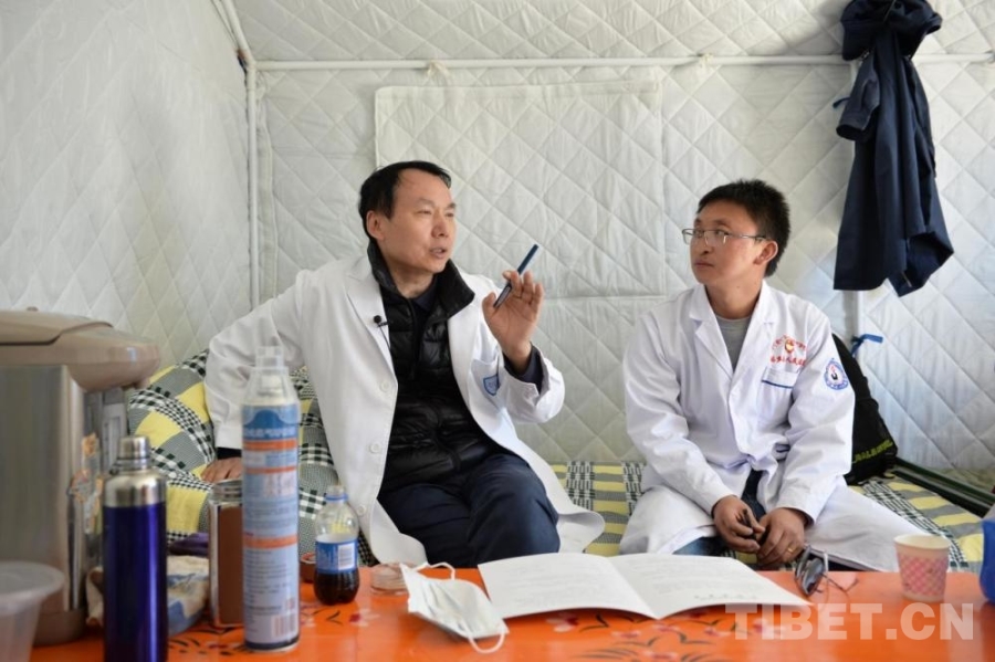 图为2021年,余震中,王建六(左)带领团队赴青海省玛多县开展宫颈癌筛查,在帐篷办公室里与当地医务工作者交流 北京同心共铸公益基金会供图