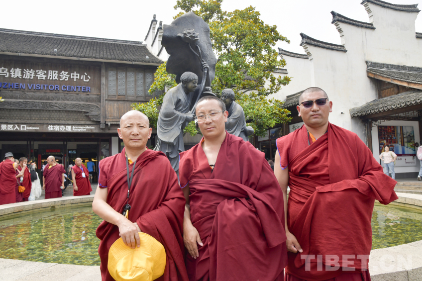 图为在乌镇西栅景区寒山拾得雕塑前西藏佛学院师生留下合影 摄影:赵振宇