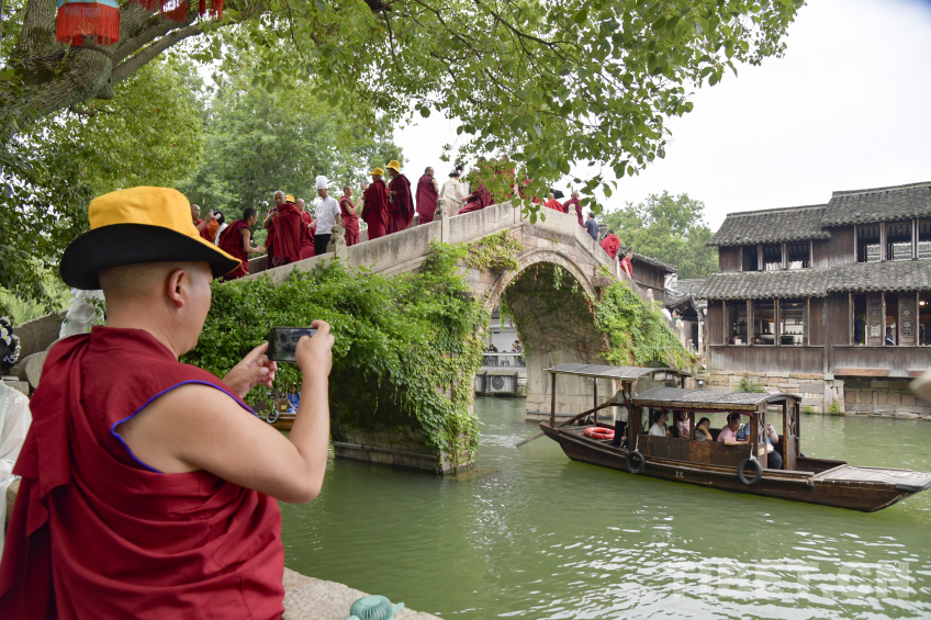 图为江南水乡间的西藏佛学院师生们 摄影:赵振宇