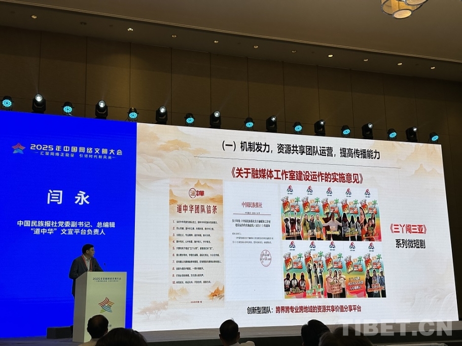 图为中国民族报社总编辑闫永围绕道中华文宣平台“讲好中华民族共同体故事的网络传播实践与思考”做主旨演讲 摄影:杨眉笑