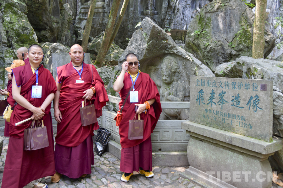 图为西藏佛学院师生在杭州参观飞来峰造像 摄影:赵振宇