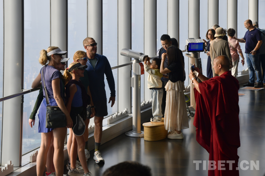 图为西藏佛学院学员在上海中心大厦为外籍游客拍照打卡 摄影:赵振宇