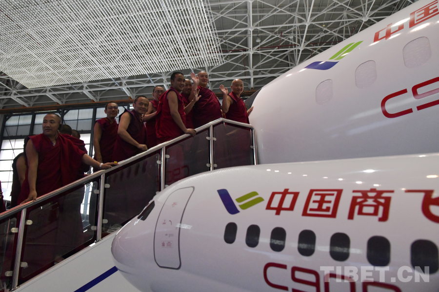 图为西藏佛学院师生在中国商飞公司登上国产飞机C909模型机参观 摄影:赵振宇