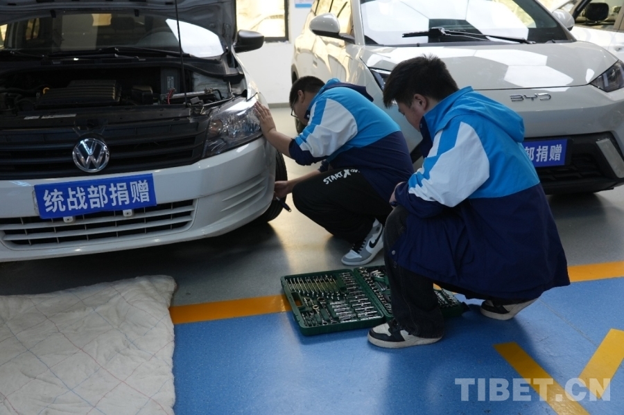 图为学生正在对汽车进行实操训练 摄影:苏洋