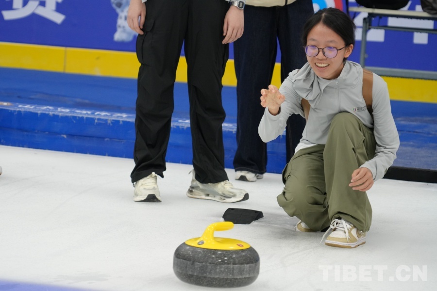 图为曲文苑在体验冰壶运动 摄影:冯重霖