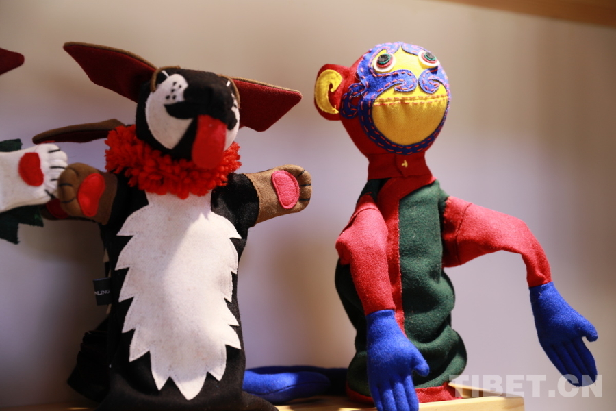 图为夏扎大院里的“卓番林·措瓦”店陈列的手工十二生肖系列手偶狗与猴 摄影:刘莉