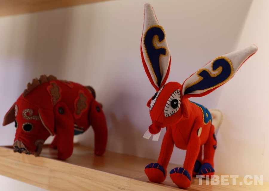 图为夏扎大院里的“卓番林·措瓦”店陈列的手工十二生肖系列玩偶猪与兔 摄影:刘莉