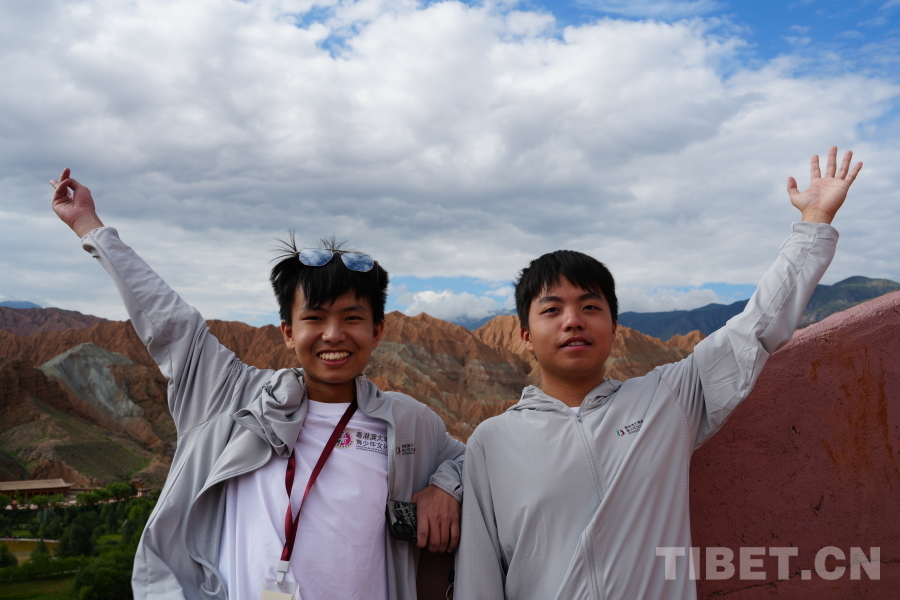图为范颂言(左)和朋友在贵德国家地质公园 摄影:邹慧