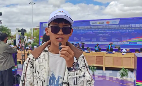 图为中国西藏第六届跨喜马拉雅国际公路自行车极限赛日喀则颁奖现场,当地高中学生旦巴加措接受采访 摄影:次旦拉姆