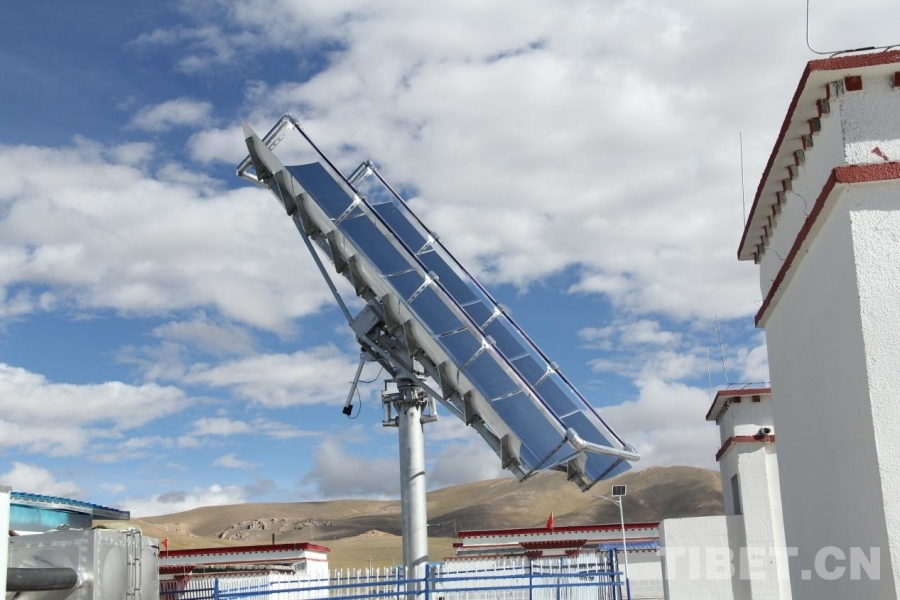 图为那曲申扎县申扎镇姜戎村新居点的巨大太阳能为村里澡堂供热水 摄影:赵钊