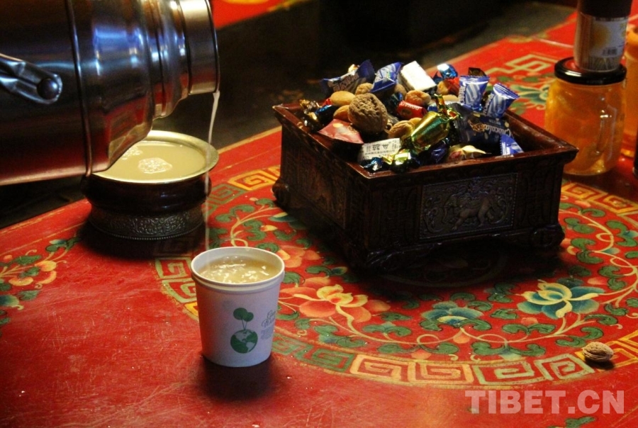 图为尼玛家的藏式桌几上摆着酥油茶、牦牛肉和各色糖果 摄影:赵钊