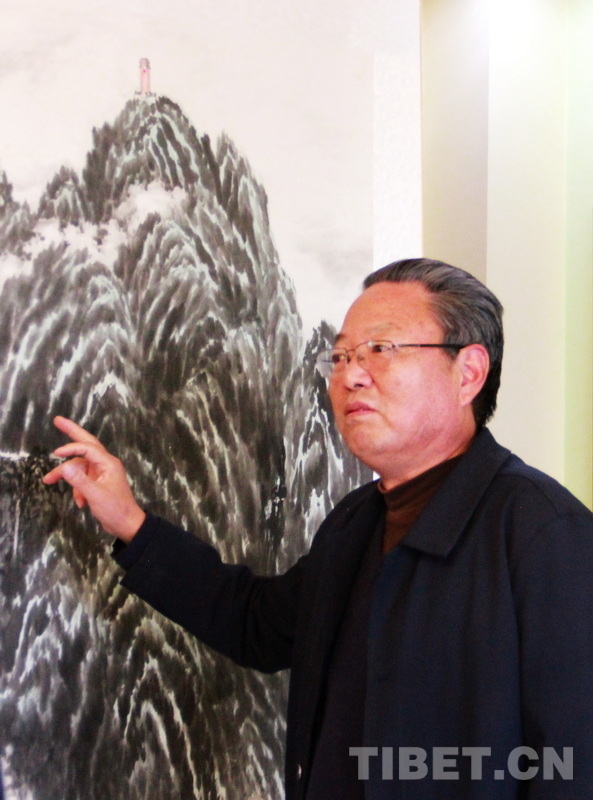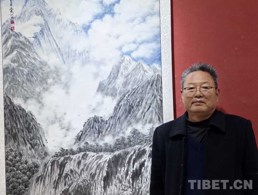 图为王藏江与他的国画作品《珠穆朗玛》