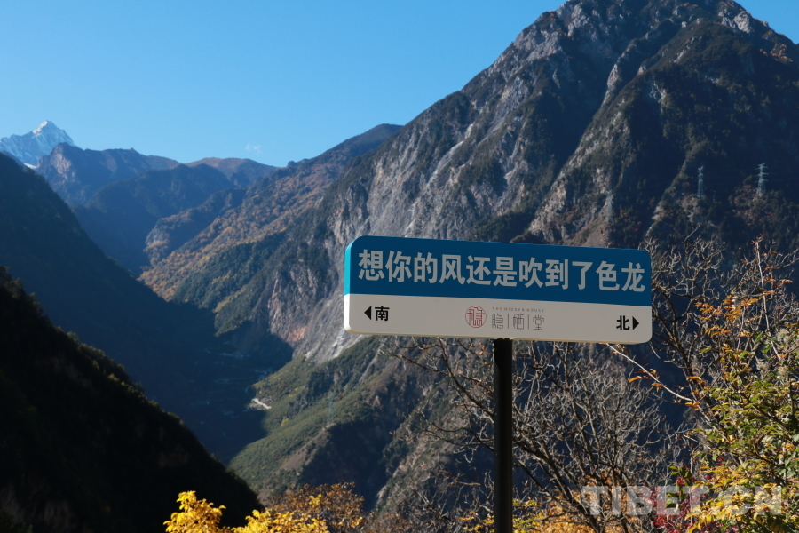 图为色龙村民宿周边的打卡牌,在雪山和秋叶的映衬下吸引着游客打卡拍照 摄影:王妍丹
