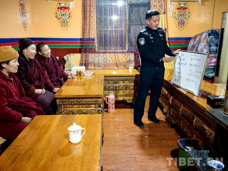图为民警更丁丁久为帕巴寺尼姑们开展国家通用语言文字学习培训