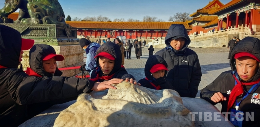 图为西藏自治区那曲市色尼区青少年足球队赴京研学团的孩子们感受故宫古老的石刻 摄影:刘莉