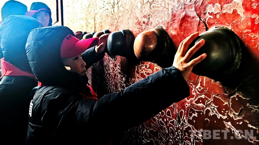 图为西藏自治区那曲市色尼区青少年足球队赴京研学团的孩子们在抚摸故宫巨大的门钉 摄影:刘莉